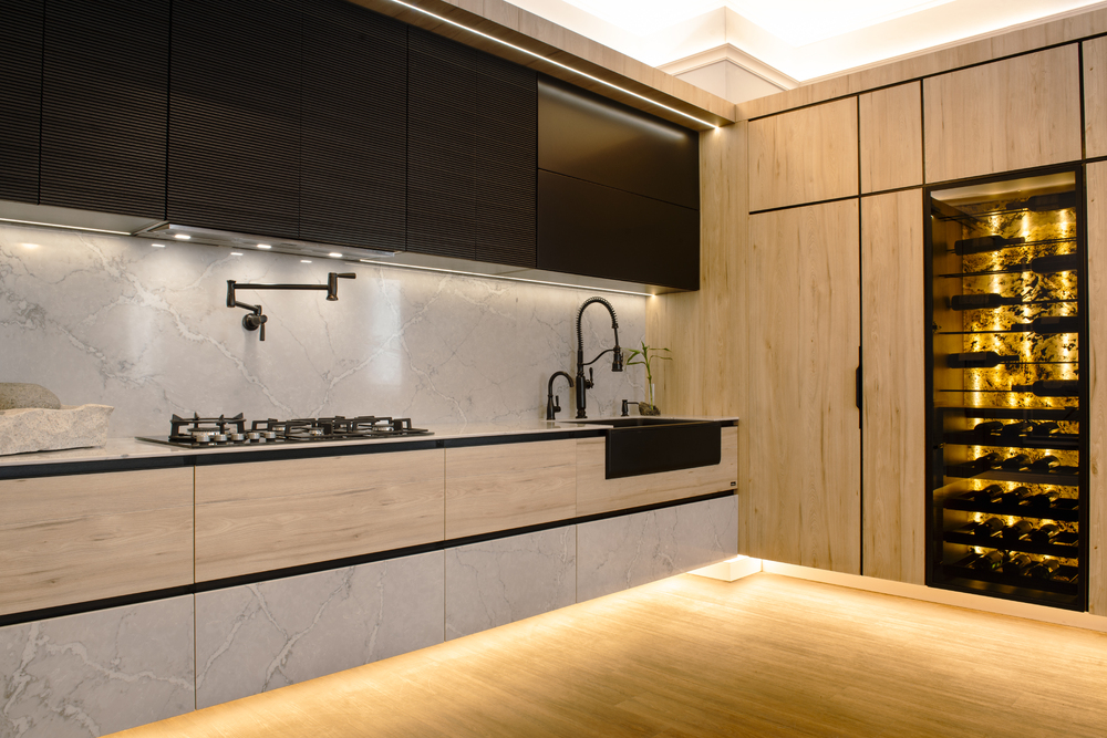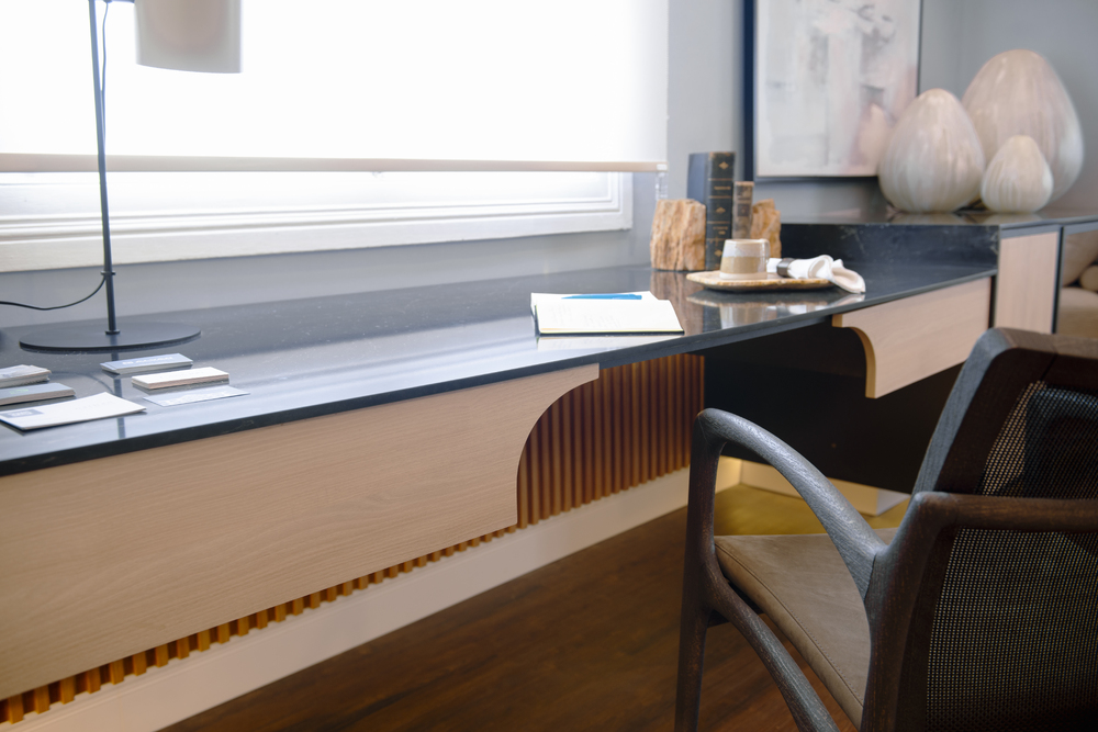 From this inspiration, we sought to ensure that each material choice contributed to the construction of a warm, functional and coherent space. In the kitchen, Black Soft and Valley melamine tabletops were integrated to create a harmonious contrast between depth and warmth. Black Soft adds sobriety and sophistication, while Valley, with its woody tone and natural texture, adds closeness and balance, shaping a functional environment with character. In the living room, the Acacia Sand design envelops the environment with its light color and soft grain, generating a luminous, serene and welcoming atmosphere that accentuates the sense of refuge that defines the project.