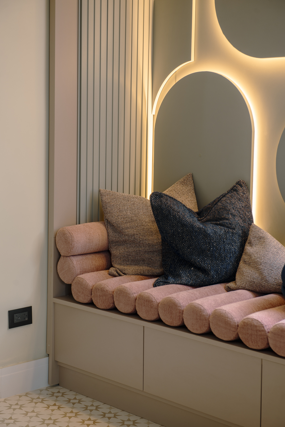 To materialize this duality, Pacific melamine design was chosen for the kitchen furniture, conceived as the core of the space. Its unicolor tone allows to visually balance the more intense elements in shades and texture, providing calm and cohesion without losing prominence. This subtle contrast becomes essential to reflect the harmonious coexistence of two distinct identities in a shared environment, which opts for integration rather than division.