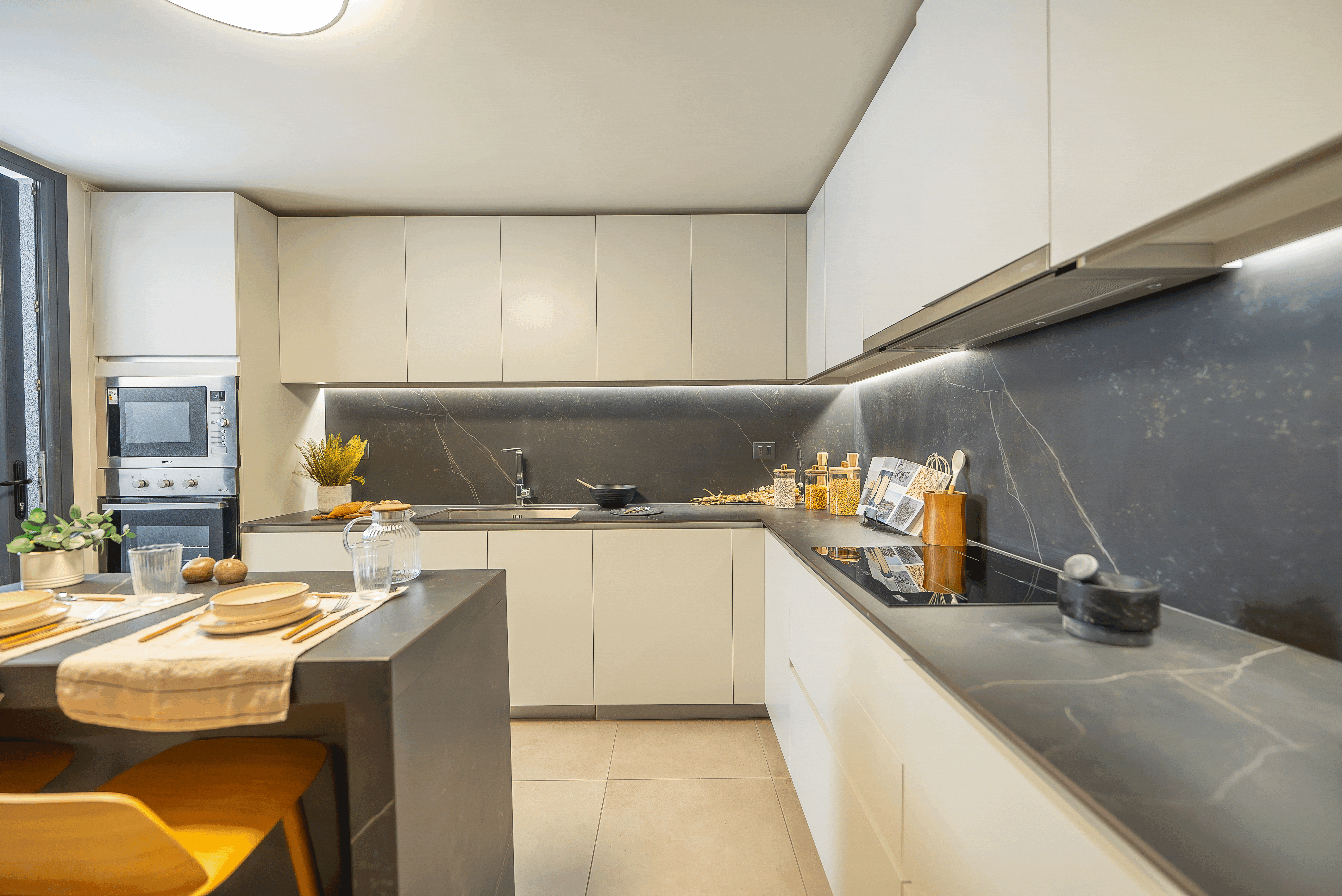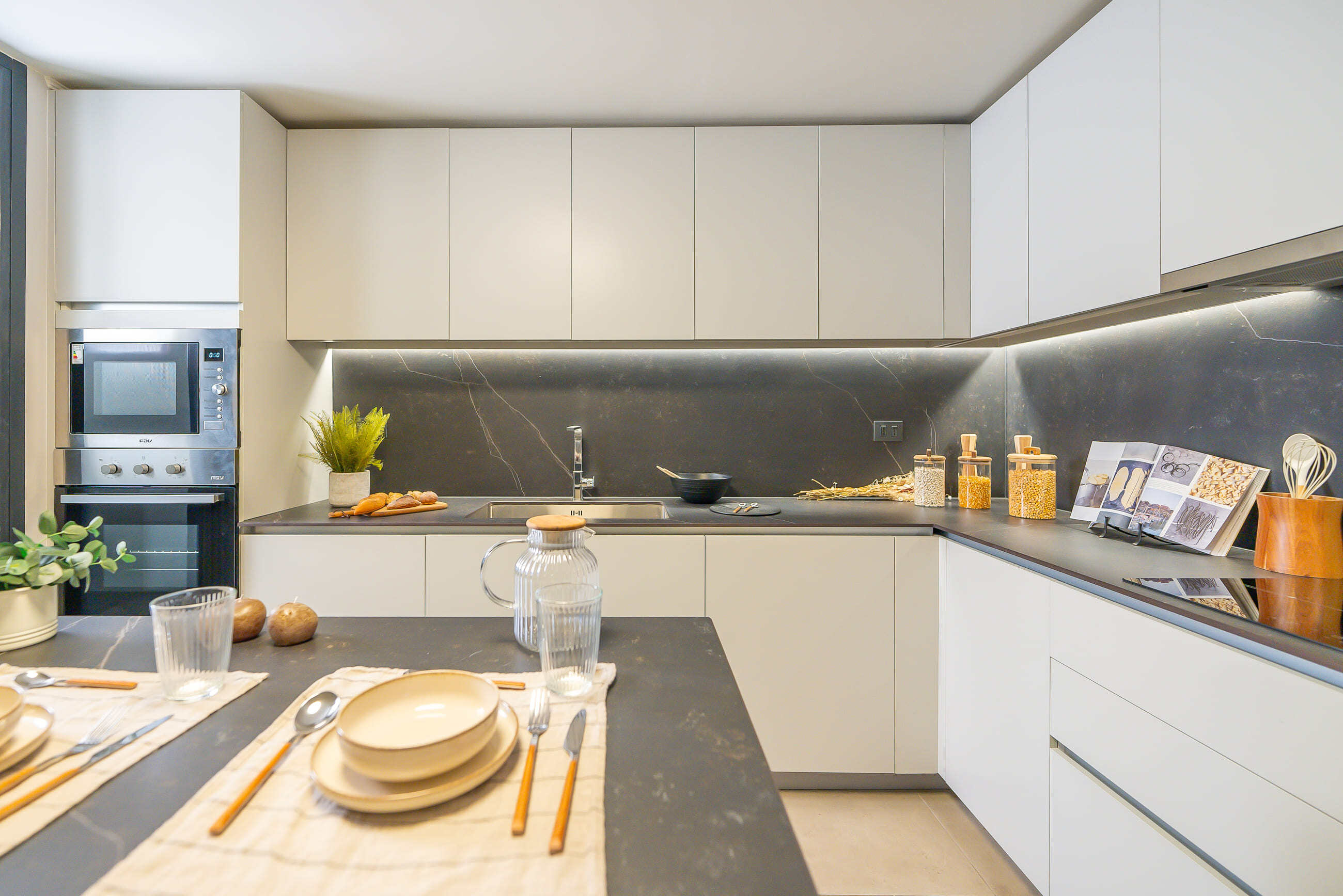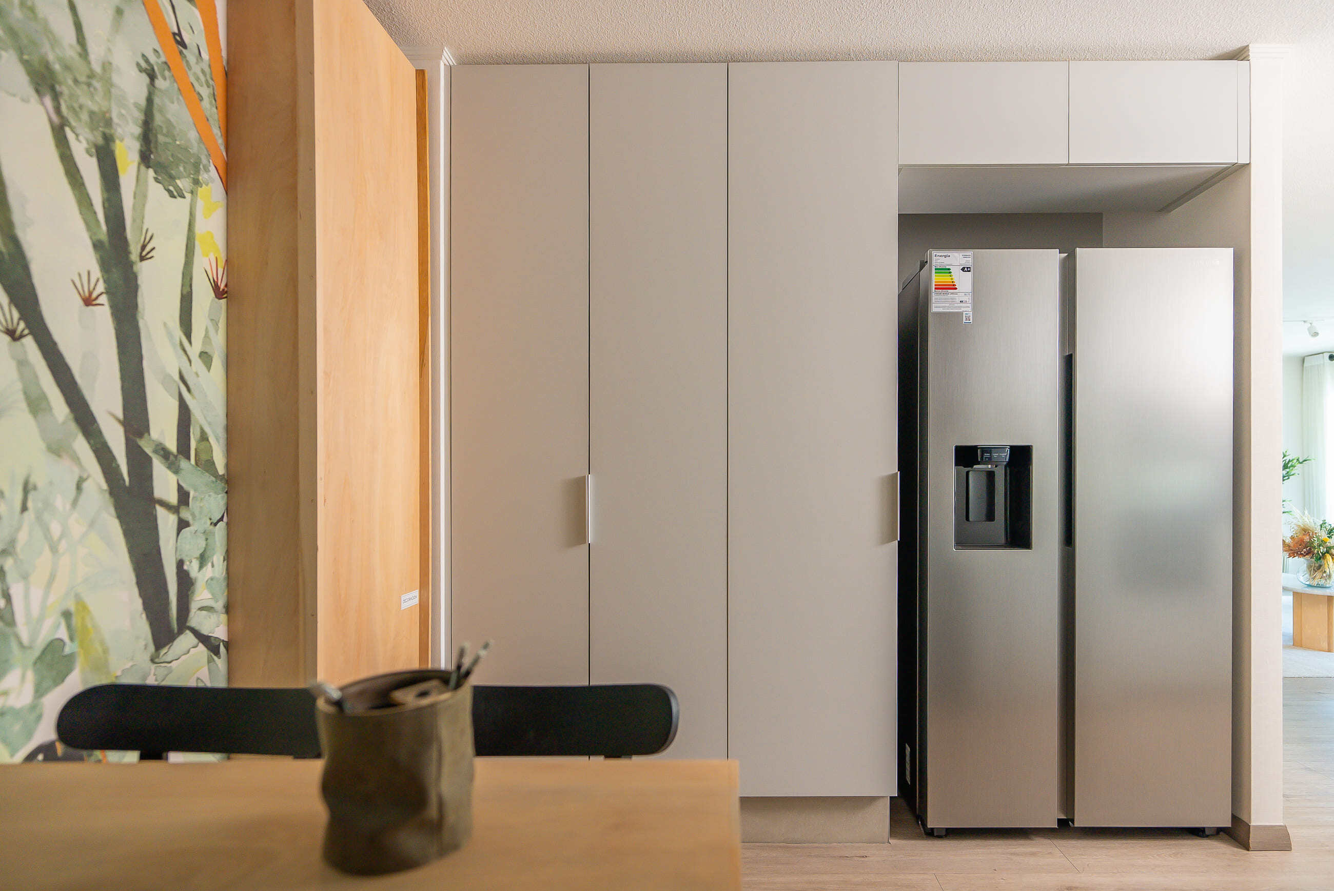 En sus cocinas, tanto abiertas como cerradas, se aplicaron melaminas grises de Masisa, logrando un equilibrio entre funcionalidad y diseño. Su tonalidad neutra permite una integración armónica con otros materiales, aportando profundidad y sofisticación a cada espacio.