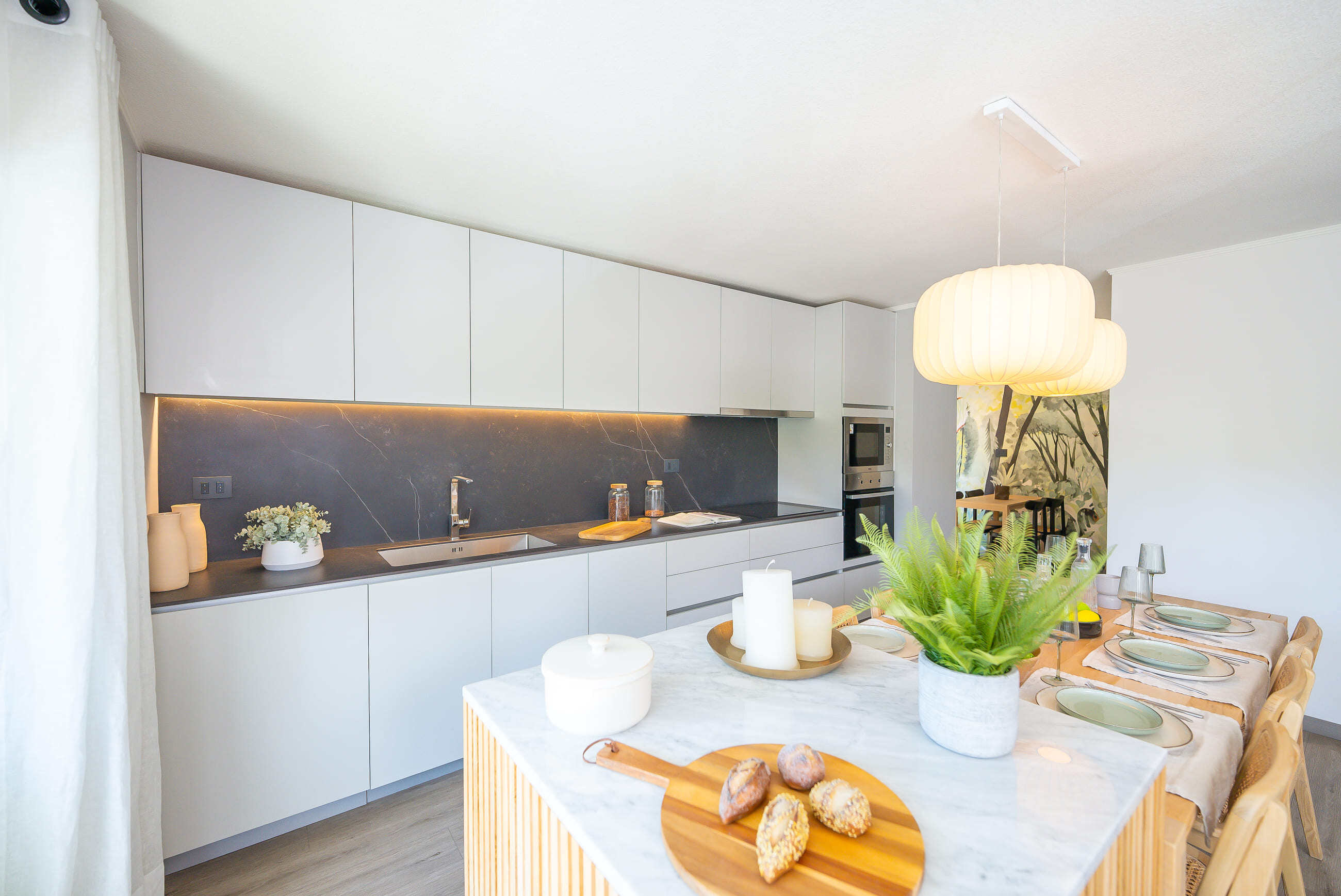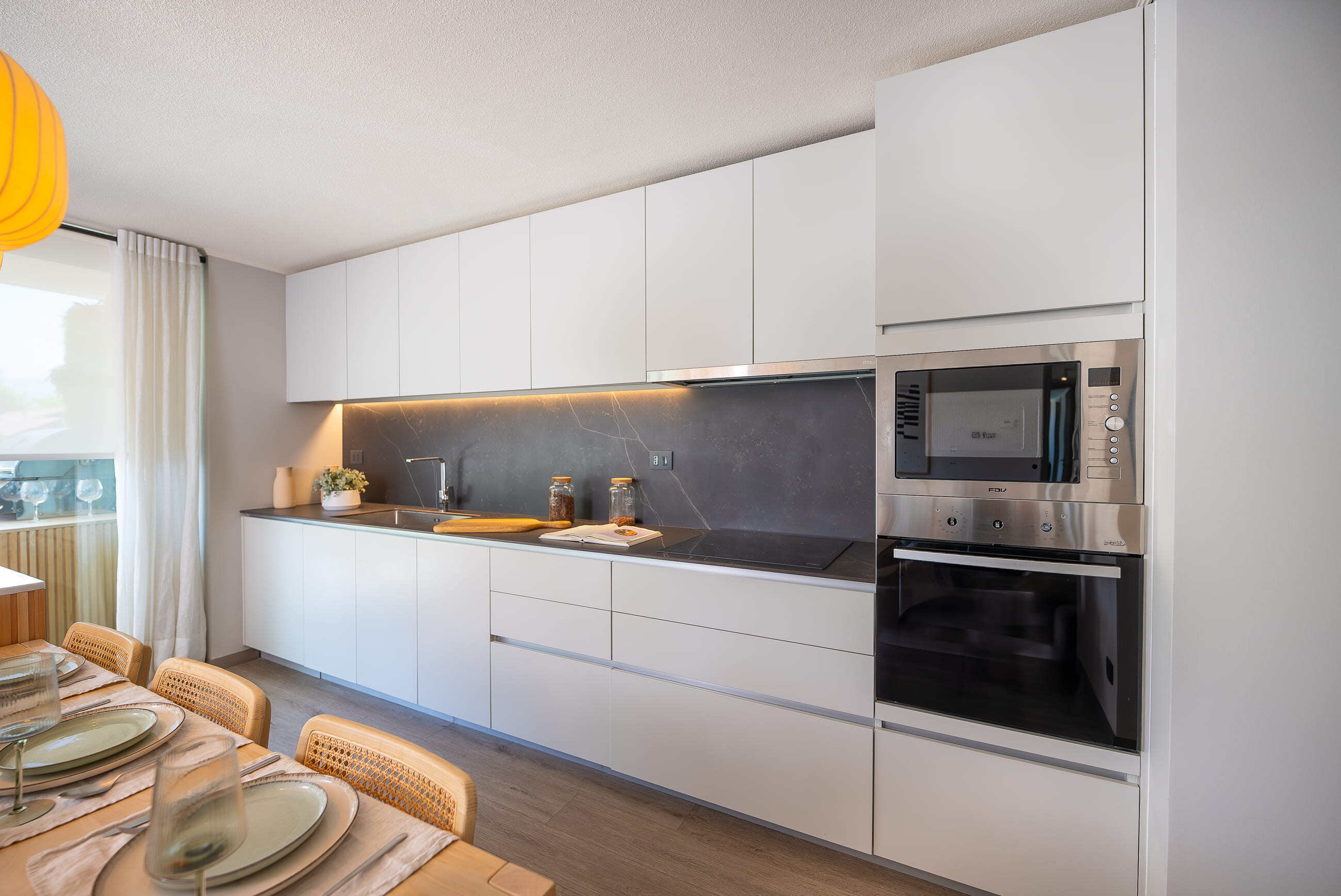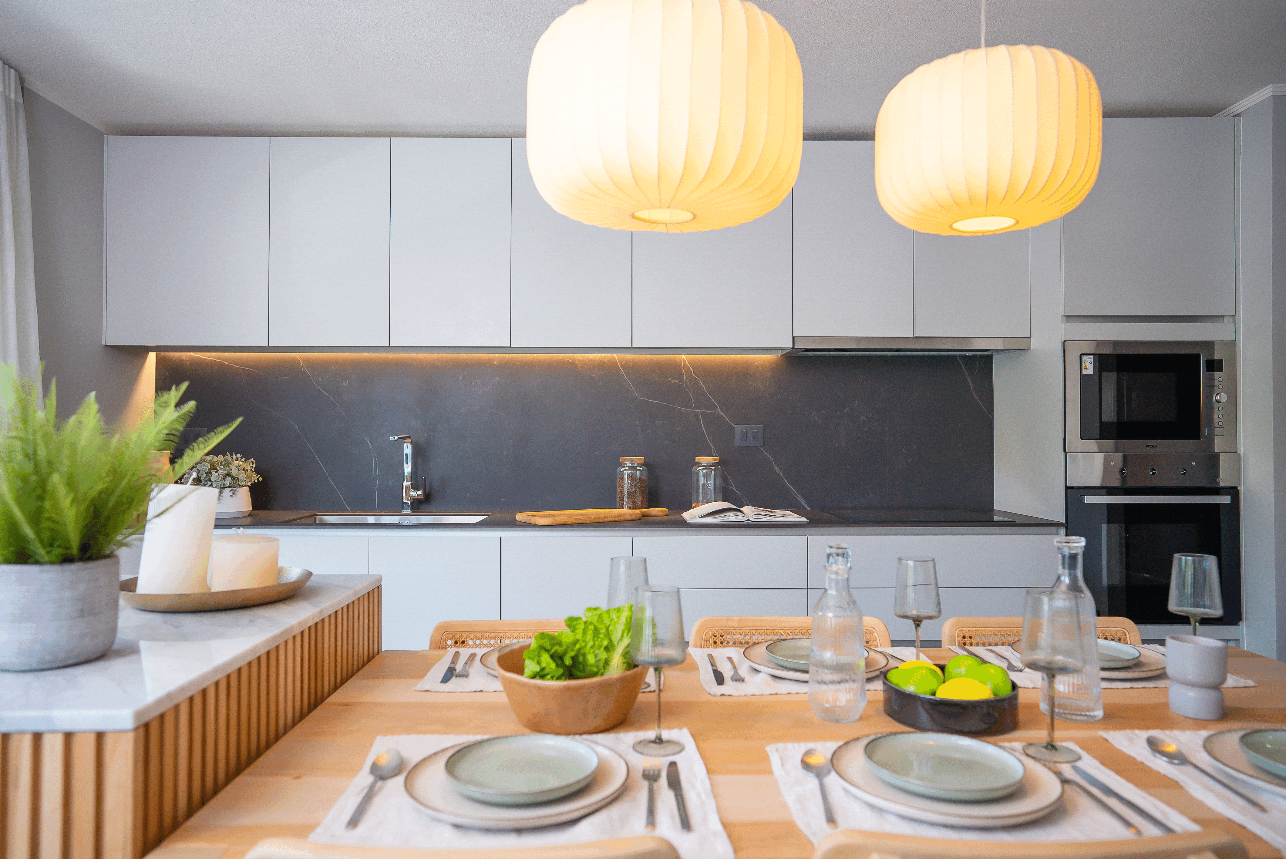En sus cocinas, tanto abiertas como cerradas, se aplicaron melaminas grises de Masisa, logrando un equilibrio entre funcionalidad y diseño. Su tonalidad neutra permite una integración armónica con otros materiales, aportando profundidad y sofisticación a cada espacio.