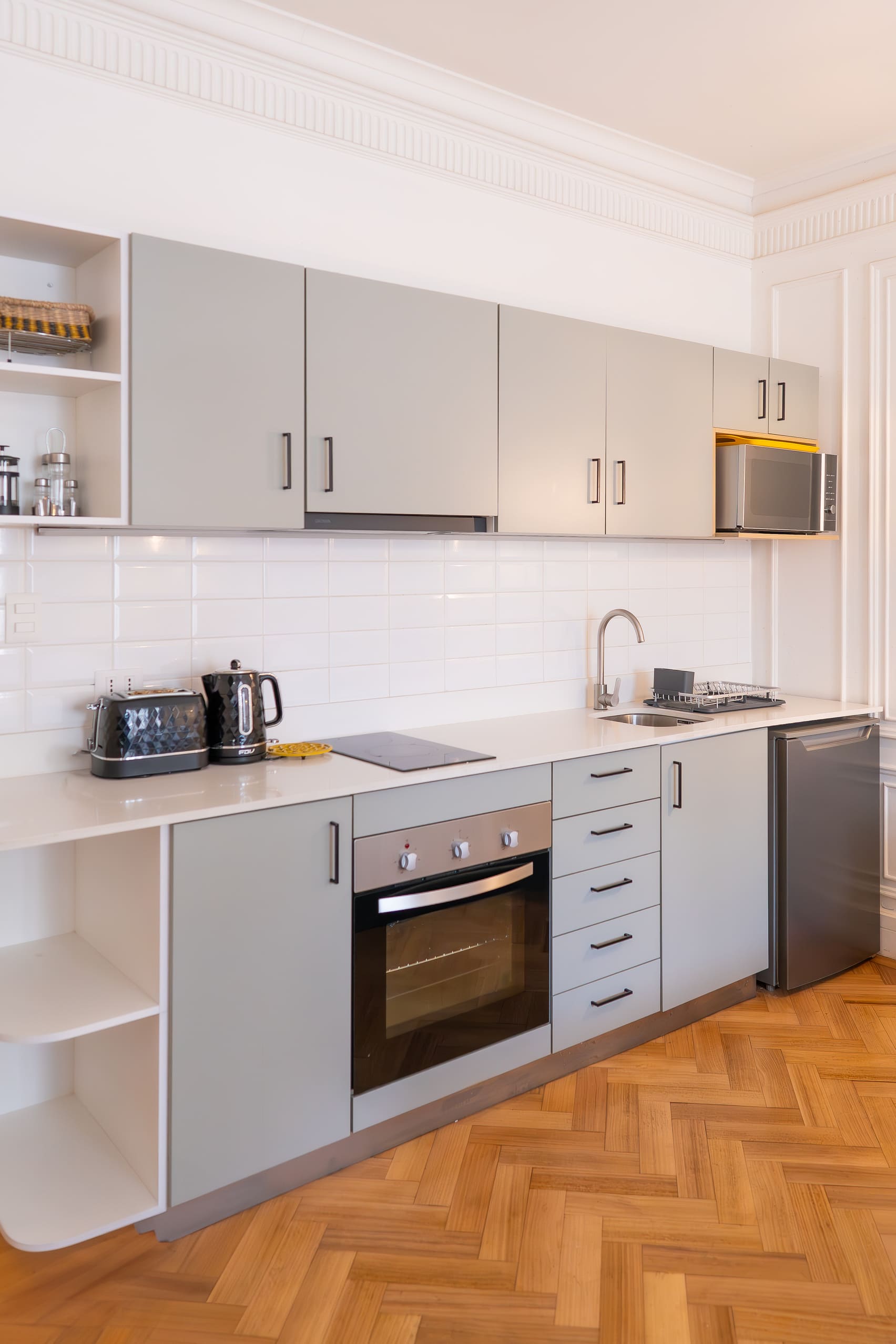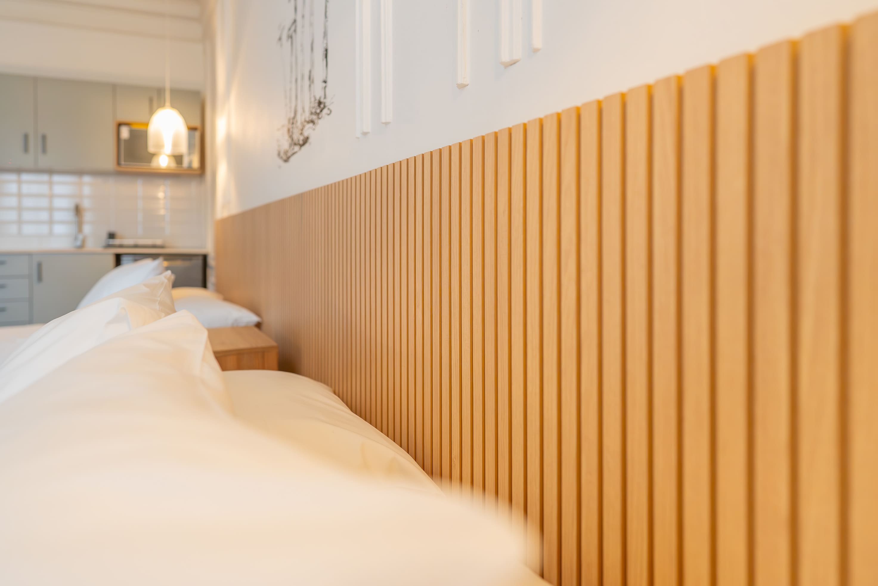 En este proyecto, los productos de Masisa desempeñaron un papel clave. La Melamina Verde Glaciar fue seleccionada para los muebles de cocina, aportando frescura y un toque contemporáneo que contrasta elegantemente con el entorno. Por su parte, el Revestimiento Ripado Carvalo se utilizó en los muros, añadiendo textura y profundidad al espacio mientras reforzaba la calidez del diseño. Ambos materiales no solo cumplen con altos estándares de durabilidad y fácil mantenimiento, sino que también se alinean con la visión minimalista y sofisticada que definió el proyecto, ofreciendo a los huéspedes un entorno visualmente atractivo y funcional.