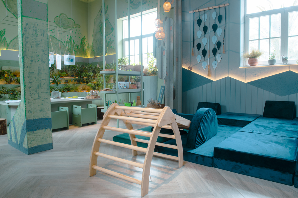 Para dar forma a este relato onírico, se utilizaron los diseños de melamina Verde Glaciar y Pacífico, esenciales para construir un ambiente que conecta con la naturaleza, la memoria y el juego. Verde Glaciar representa la relación con el entorno natural y fue aplicado en zonas dedicadas al aprendizaje y la exploración sensorial. Pacífico, en su tonalidad azul, remite a los apus, montañas sagradas de la cosmovisión andina, integrando profundidad y serenidad. Estos tableros no solo permitieron desarrollar mobiliario funcional, sino también dar forma a piezas orgánicas como cactus y cerros, que aportan movimiento al lugar. Es un entorno que celebra la infancia. La totalidad del espacio invita a escalar, trepar y jugar, estimulando la interacción desde el diseño y la experiencia.