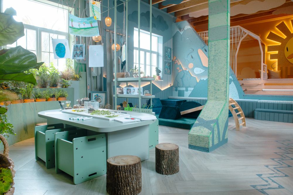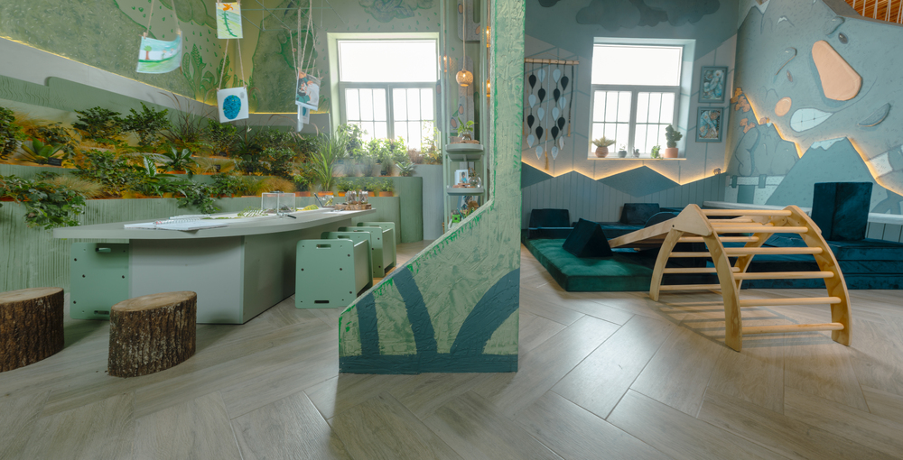 To give shape to this dreamlike story, Glaciar Green and Pacific melamine designs were used, essential to build an environment that connects with nature, memory and play. Glaciar Green represents the relationship with the natural environment and was applied in areas dedicated to learning and sensory exploration. Pacific, in its blue tone, refers to the apus, sacred mountains of the Andean cosmovision, integrating depth and serenity. These panels not only allowed the development of functional furniture, but also gave shape to organic pieces such as cactus and hills, which bring movement to the place. It is an environment that celebrates childhood. The entire space invites climbing, climbing and playing, stimulating interaction through design and experience.