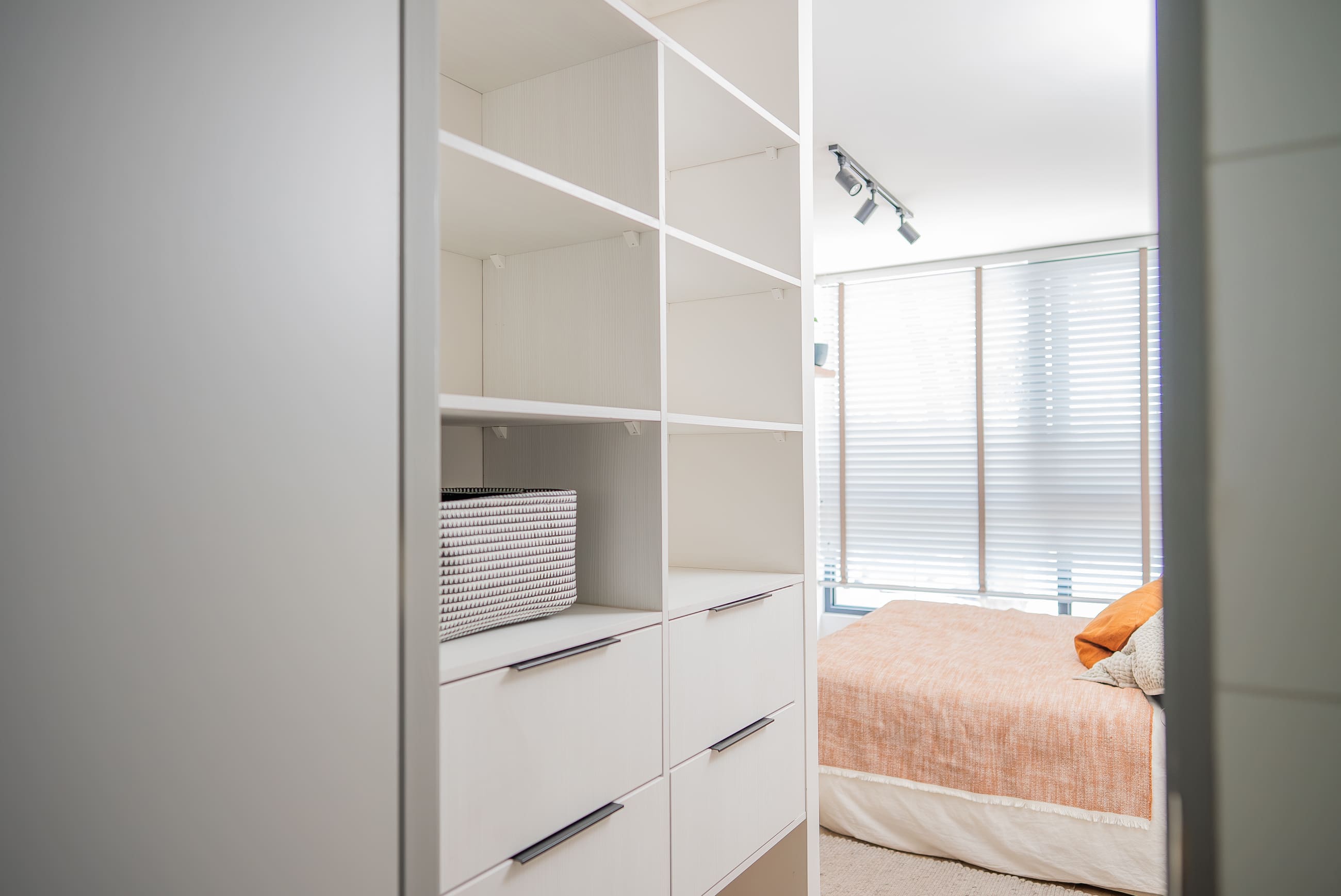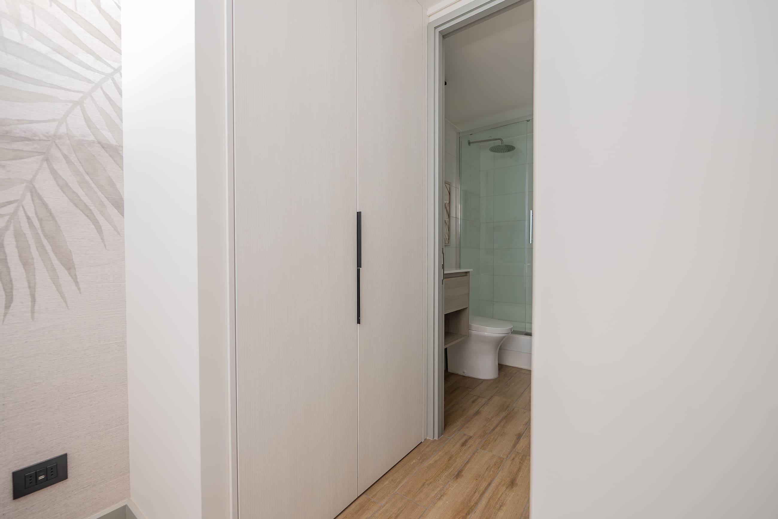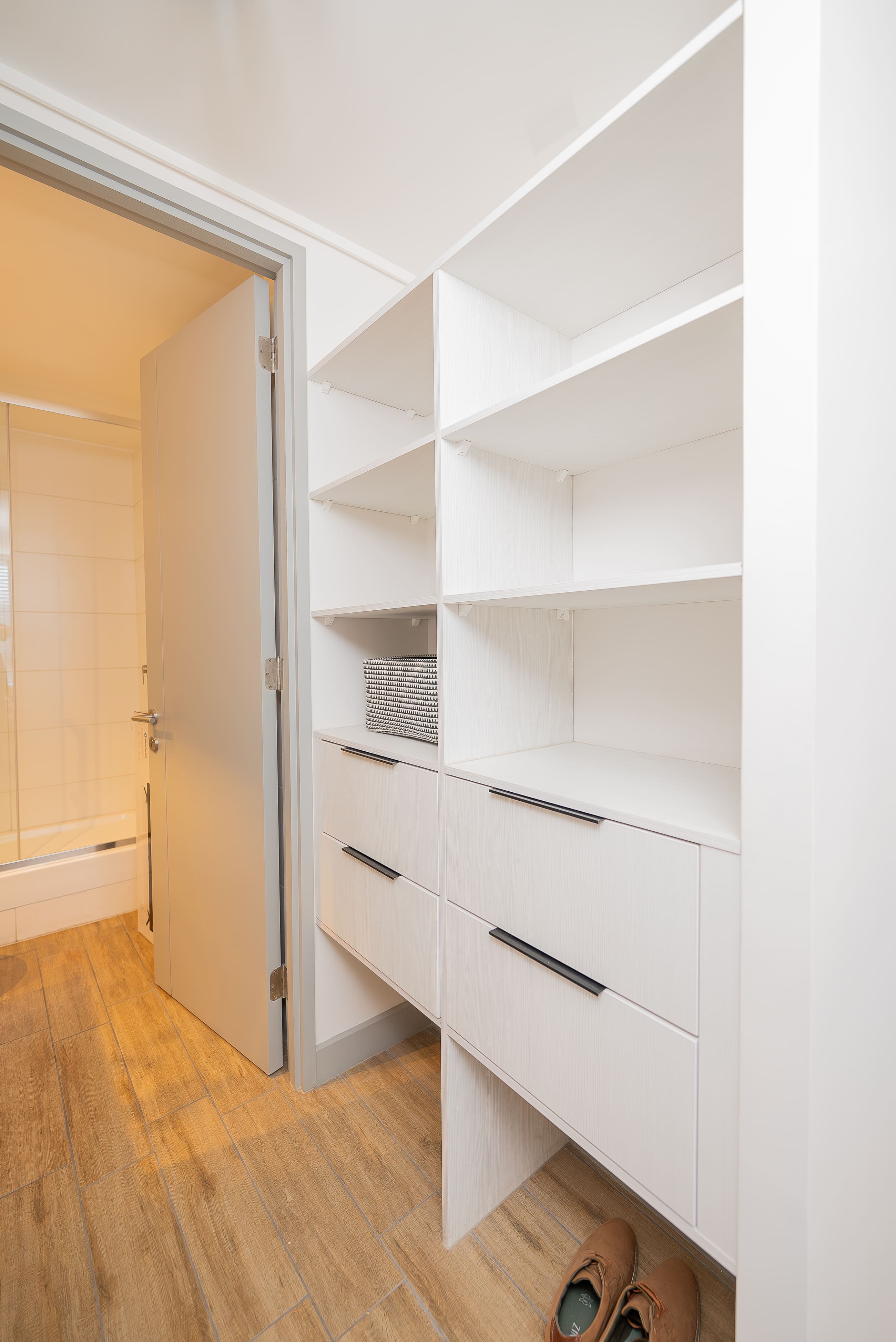 Su acabado suave y sereno genera un espacio acogedor, estableciendo una conexión armónica con los colores del entorno. En los clósets, la elección fue Melamina Laricina, cuya textura y tonalidad refuerzan una estética orgánica, brindando una sensación de calidez y equilibrio en cada detalle. Su diseño en tonos neutros y acabado texturizado complementa el mobiliario, optimizando el espacio y logrando ambientes más funcionales y acogedores.