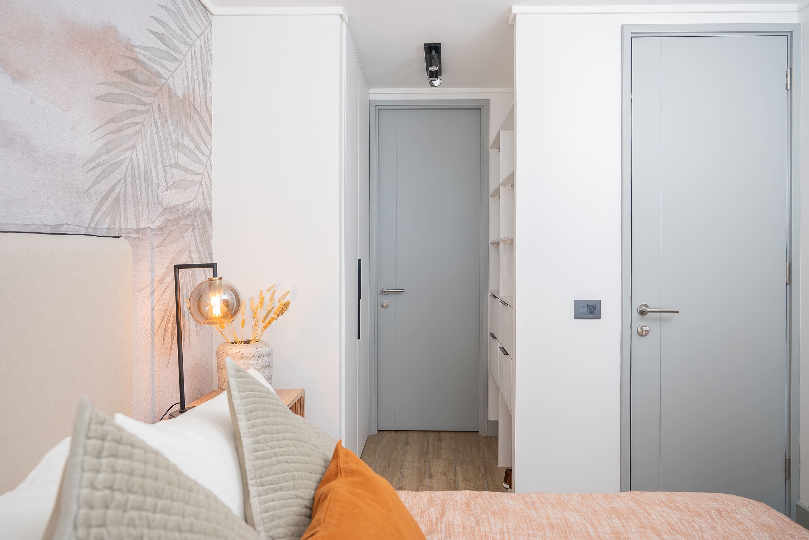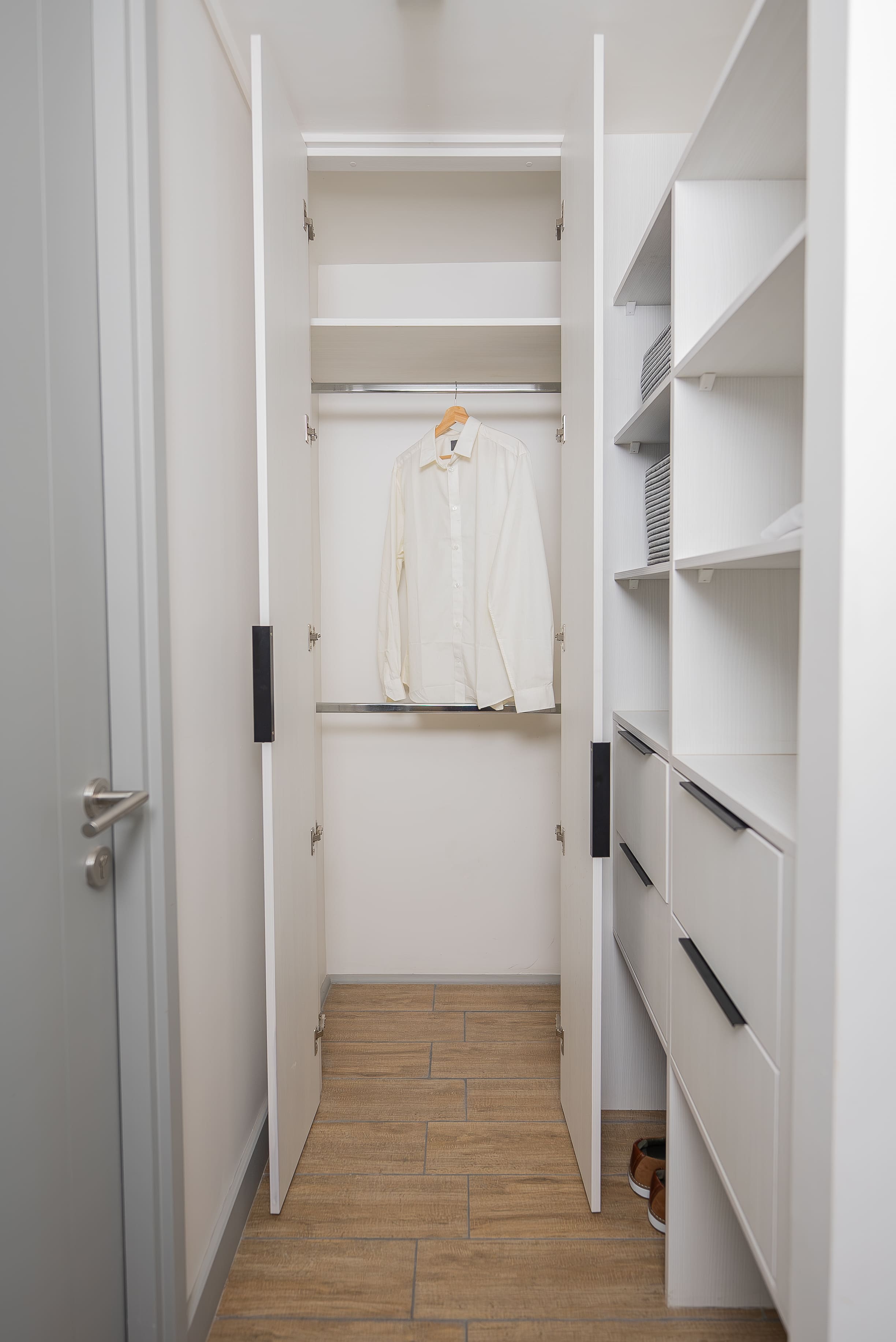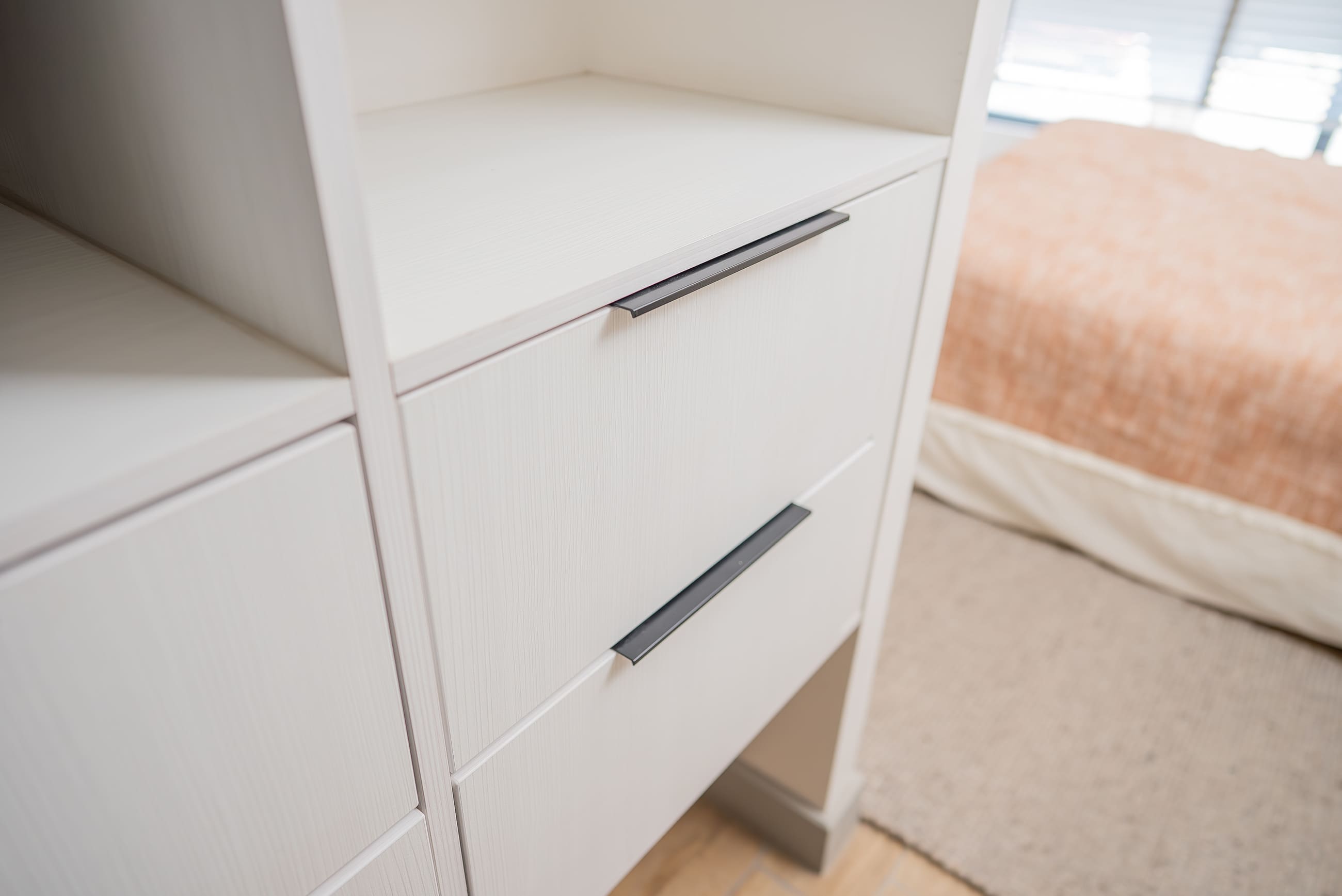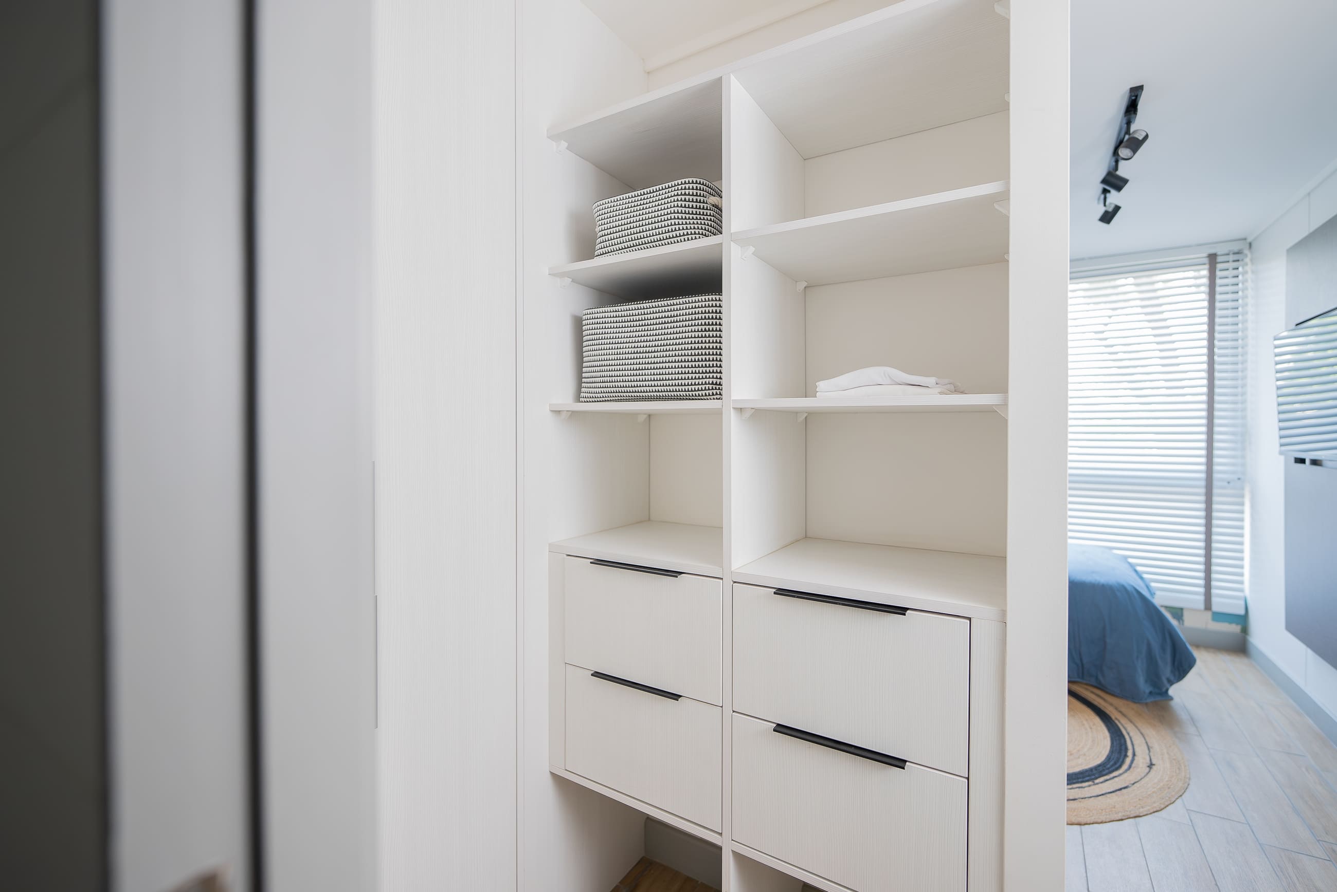 Su acabado suave y sereno genera un espacio acogedor, estableciendo una conexión armónica con los colores del entorno. En los clósets, la elección fue Melamina Laricina, cuya textura y tonalidad refuerzan una estética orgánica, brindando una sensación de calidez y equilibrio en cada detalle. Su diseño en tonos neutros y acabado texturizado complementa el mobiliario, optimizando el espacio y logrando ambientes más funcionales y acogedores.