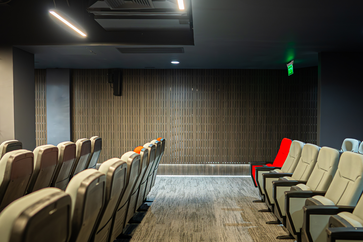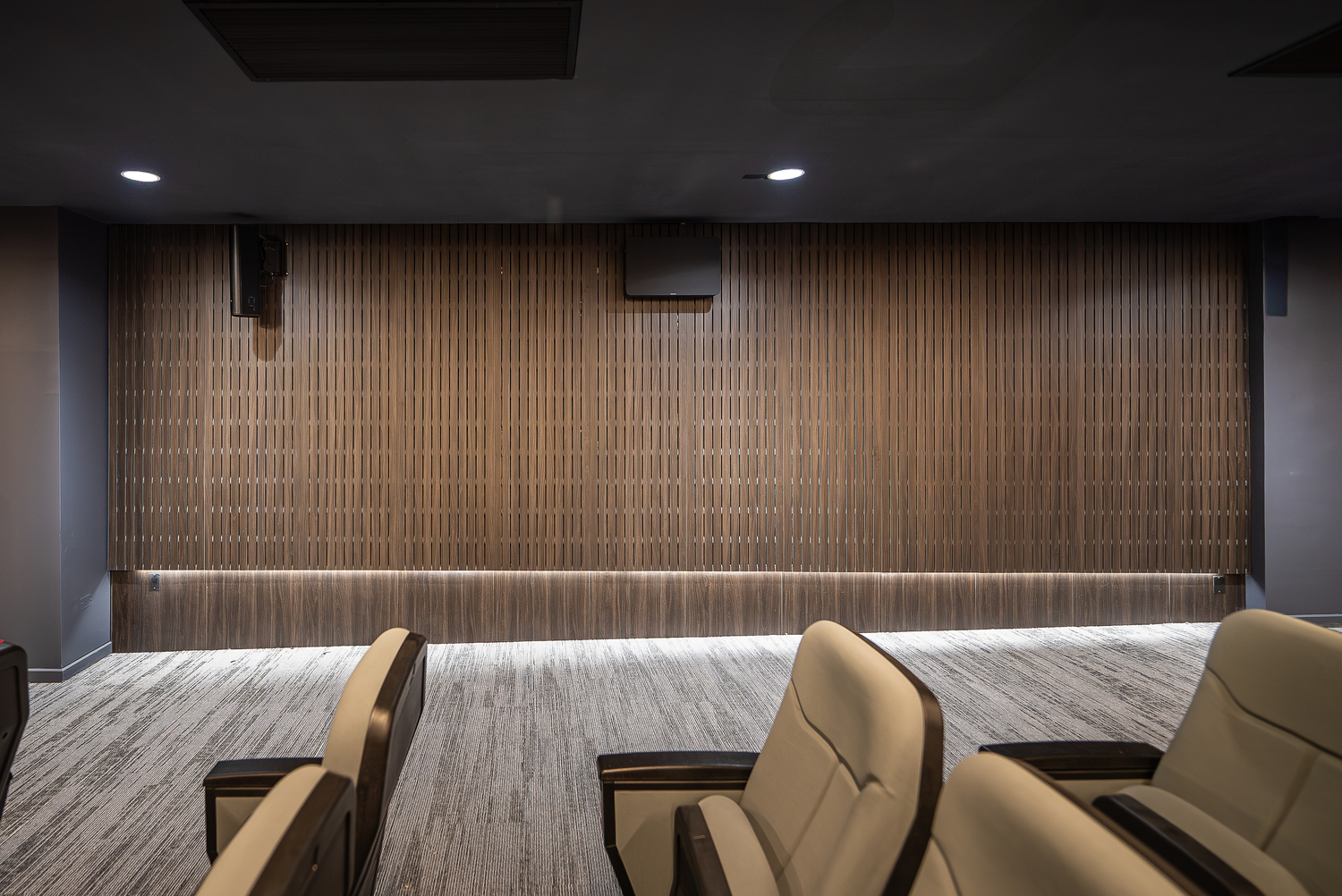 Para este espacio se utilizaron Paneles Acústicos Ondas Listón Fogón y Panel Liso Fogón, fabricados en MDF Melamina. Su tonalidad oscura aporta profundidad y una estética contemporánea que complementa la iluminación suave y el diseño sobrio del auditorio. Estos revestimientos no solo entregan calidez visual,  sino que también permiten que el sonido se mantenga claro, controlado y sin rebote, algo esencial en clases, presentaciones y actividades académicas.