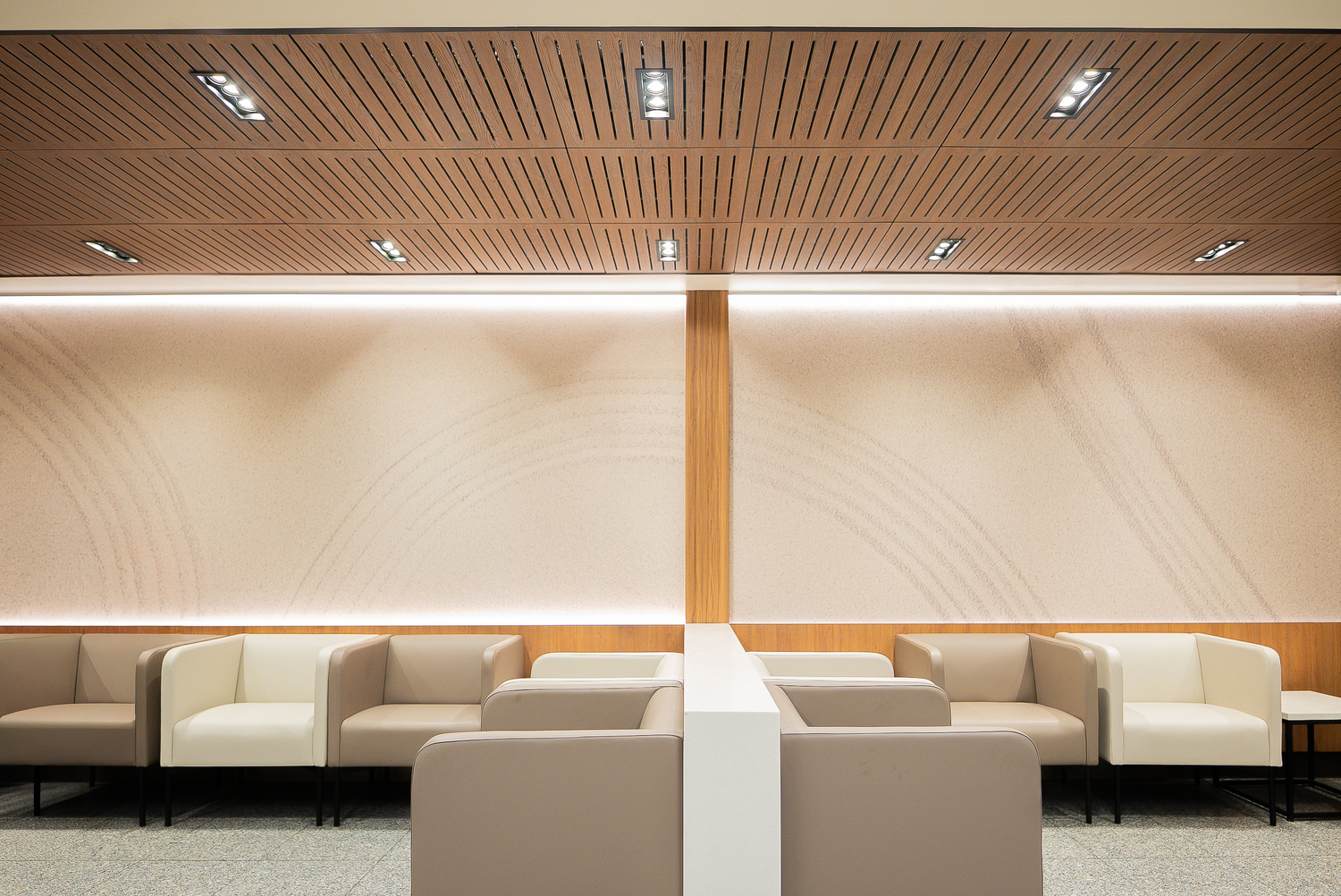 En las salas de espera del primer piso y recepción de la Clínica Alemana, ubicada en Santiago de Chile, los Paneles Acústicos Masisa Ondas Listón en tono Bosco transforman por completo la experiencia del espacio. Su diseño en listones finos y su tonalidad en madera oscura aportan calidez y una sensación más cercana, alejándose del ambiente frío que comúnmente se asocia a los centros de salud.