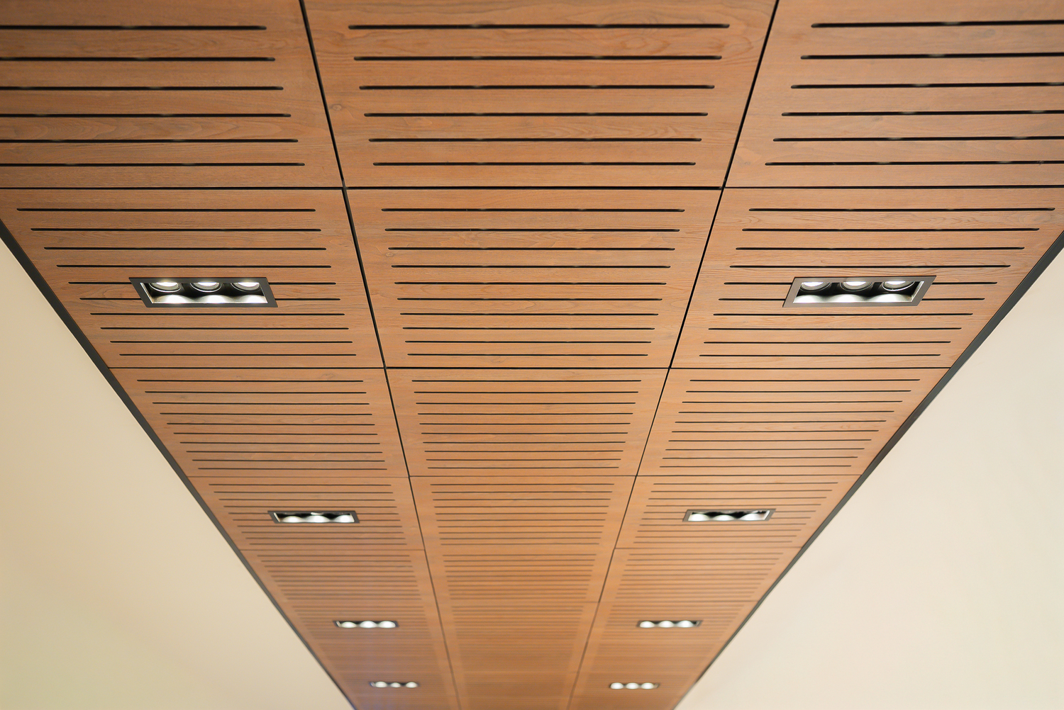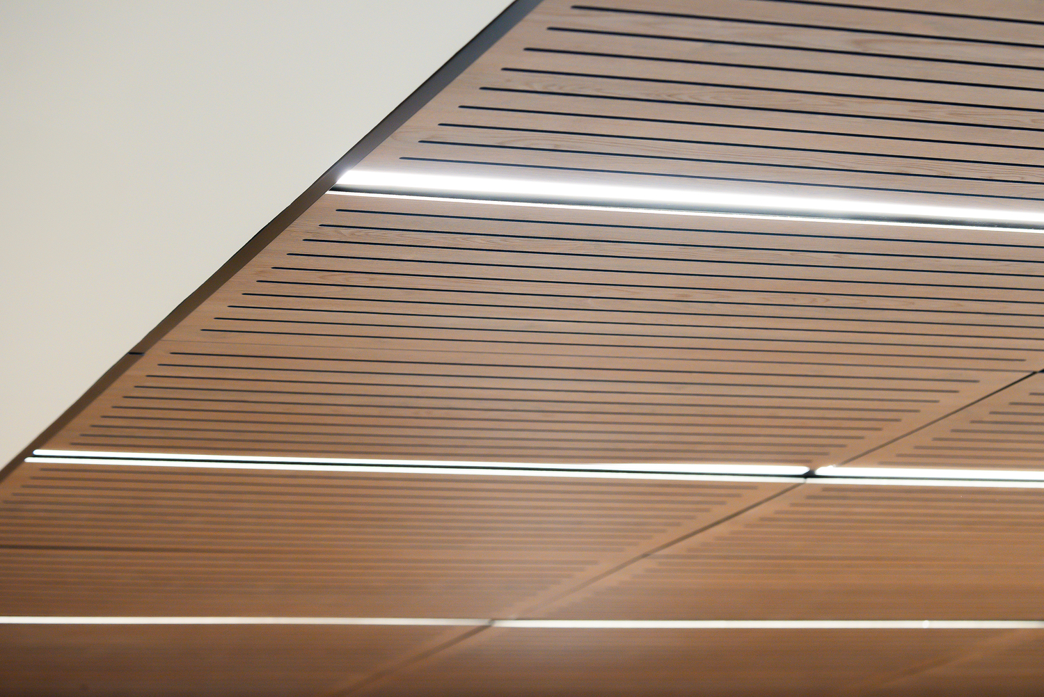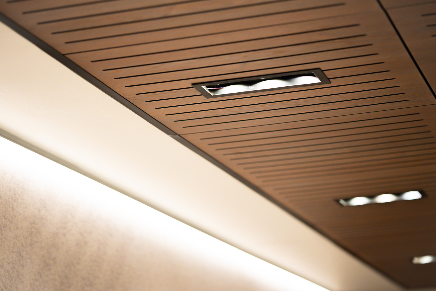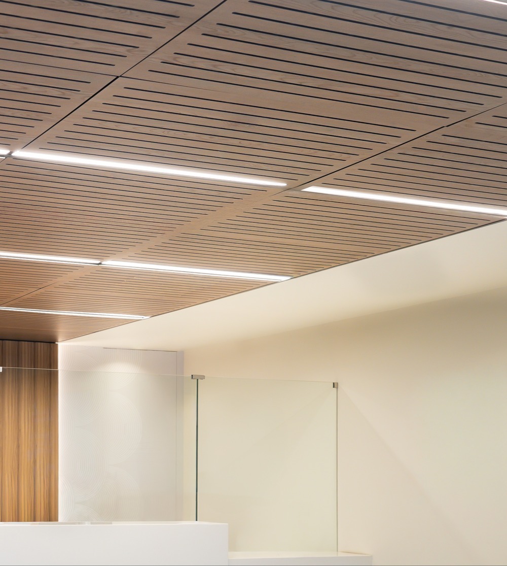 Los paneles recorren el cielo en módulos continuos y ordenados, integrándose de manera precisa con las luminarias y con la línea arquitectónica del lugar. El color Bosco, junto a la iluminación cálida perimetral, genera un contraste elegante que realza la textura de los listones y aporta profundidad visual.