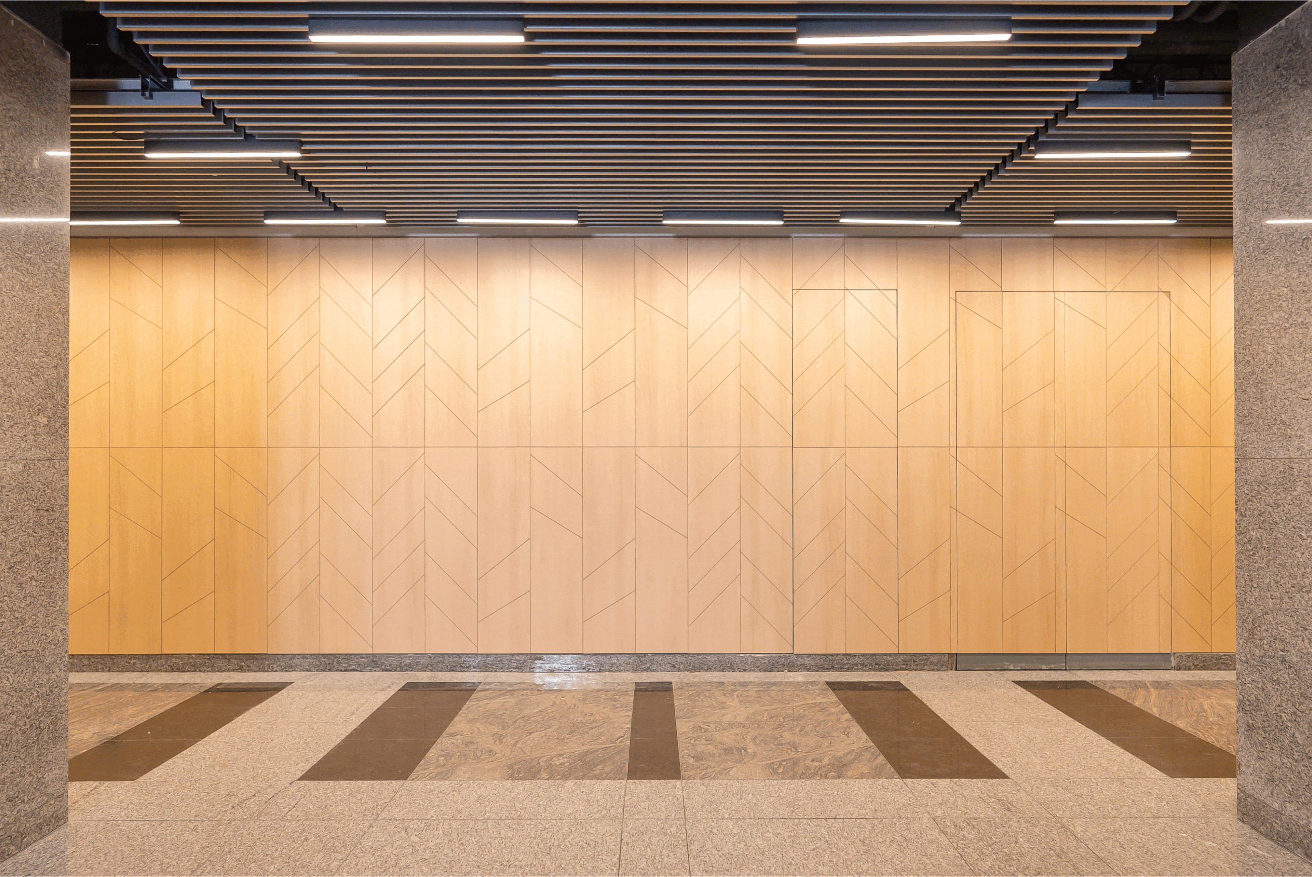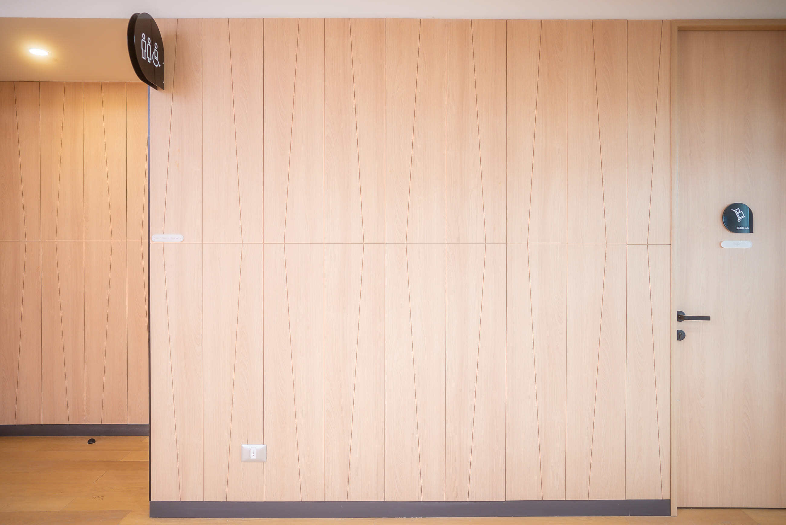 En la entrada, se aplicaron Palmetas Chevron en acabado Carvalo, creando un entorno limpio y acogedor que refuerza la identidad del lugar. Además, se incorporaron puertas ocultas, optimizando el uso del espacio sin alterar la continuidad visual del diseño.