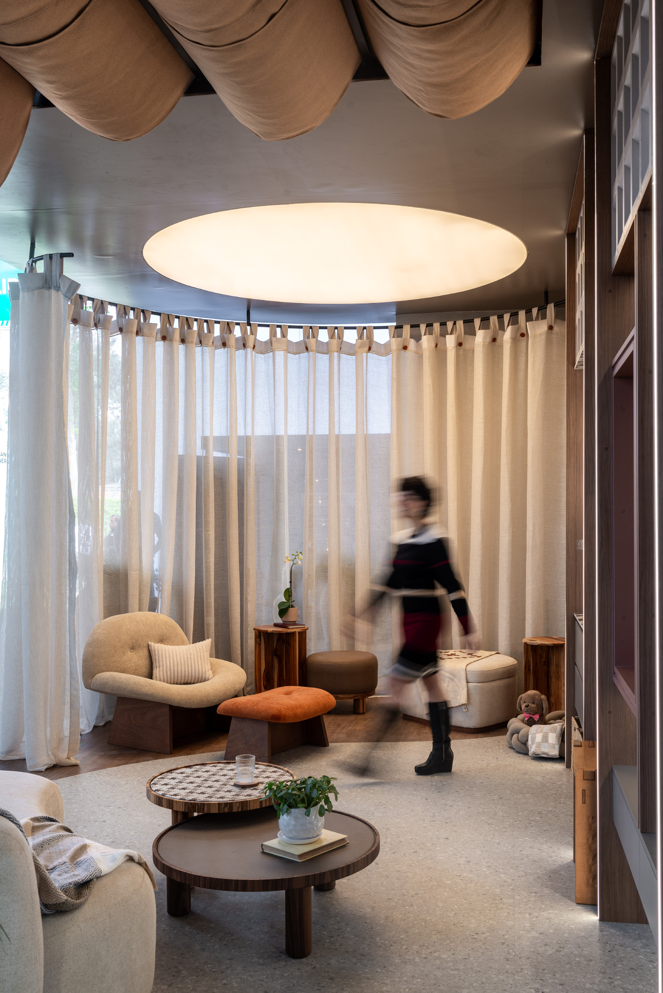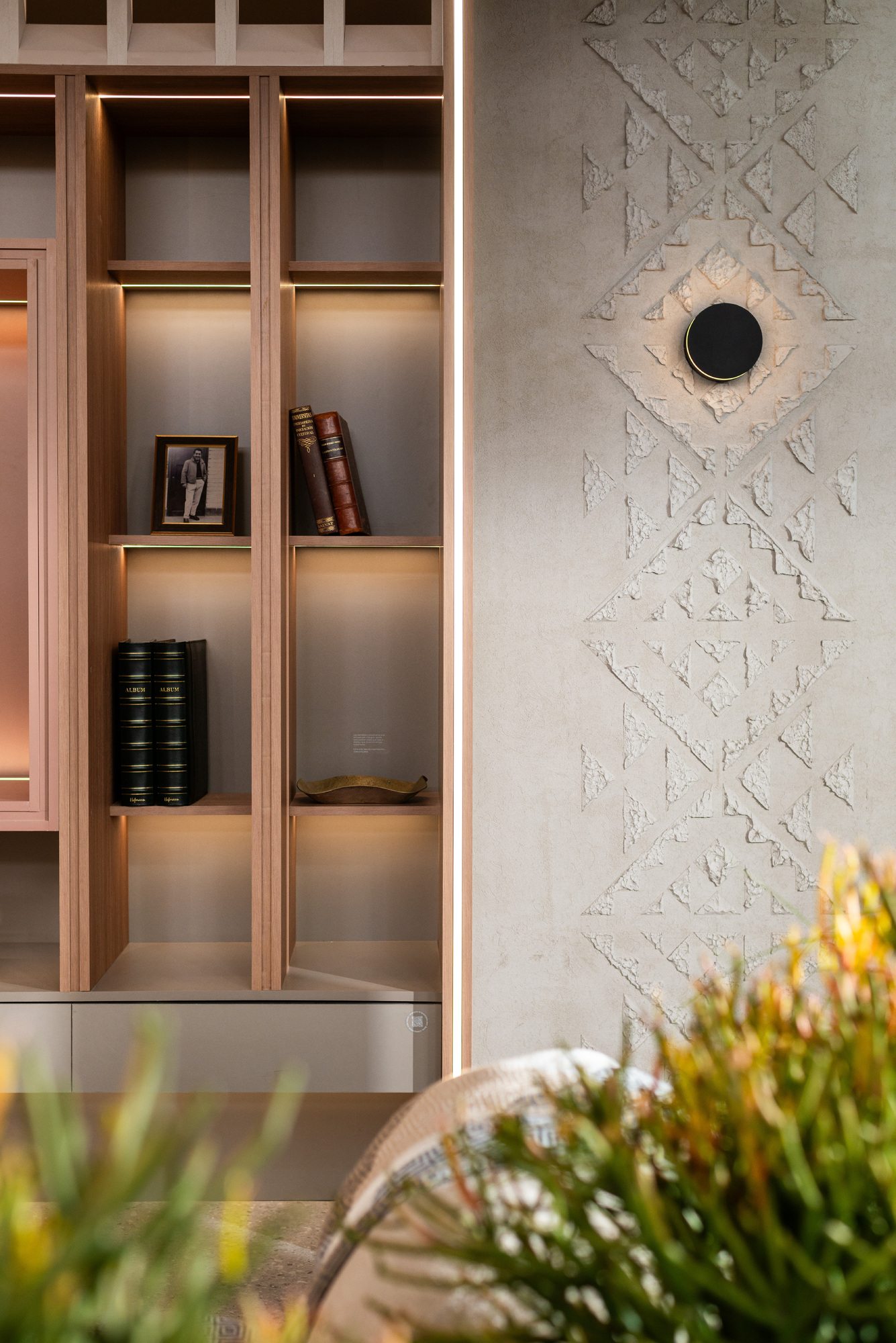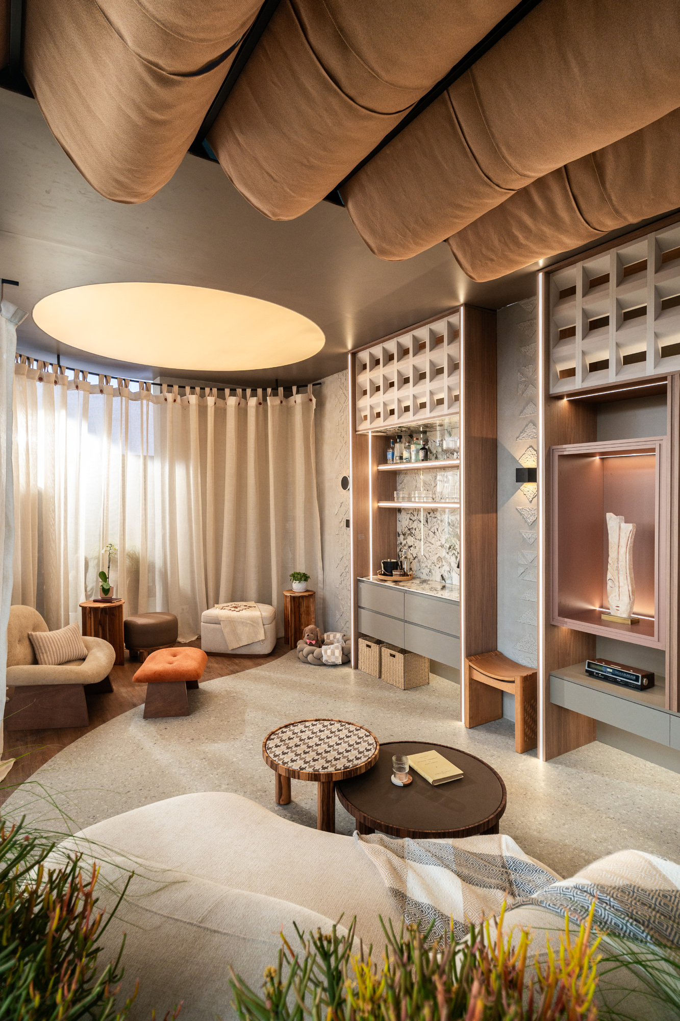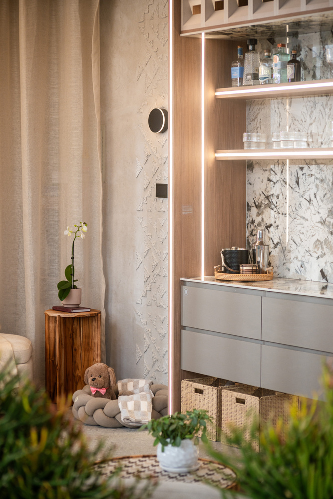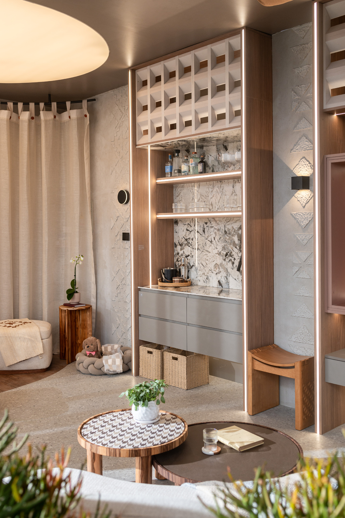 Con una superficie de 28 m², el espacio fue concebido como un viaje emocional hacia los orígenes, donde el diseño actúa como un medio para reconectar con la memoria y resignificar la forma en que habitamos. Para ello, se incorporaron diseños de la nueva colección de melaminas Masisa: Nogal Biloba, presente en las repisas y en la estructura externa del mueble bar y del mueble exhibidor de recuerdos; Terracota, utilizado para crear un nicho que enmarca una escultura destacada dentro del mismo mueble; Manglar, aplicado en la cajonería de ambos muebles; y Uyuni, que reviste la celosía de cubos ubicada en la parte superior de ambas piezas. Cada uno de estos tonos contribuyó a construir una atmósfera con carácter, equilibrio y profundidad, dando forma a una propuesta estética que honra las raíces y pone en valor la materialidad y la creación de espacios que se pueden sentir.